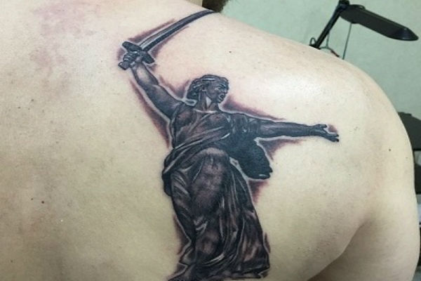 В кресле мастера мужчина провел 3 часа, в результате чего на правой половине спины, от плеча почти до поясницы, появилась памятная скульптура. Она является центром памятника-композиции героям Сталинградской битвы на Мамаевом кургане в Волгограде.