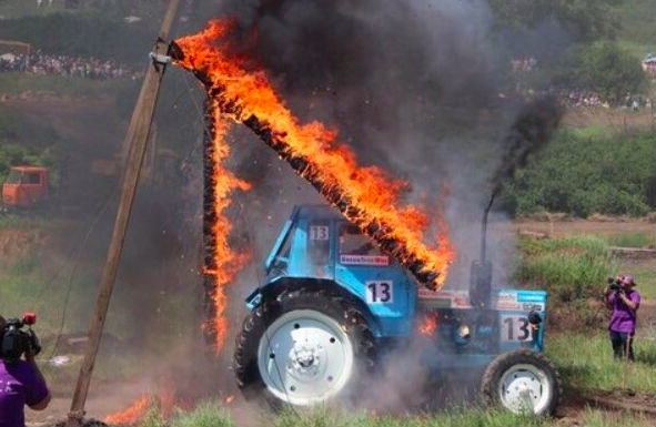Пилот машины № 13 не вписался в поворот и врезался в опору горящих ворот, установленных на трассе. Дежурившие во время соревнований сотрудники пожарной охраны оперативно потушили загоревшийся трактор.