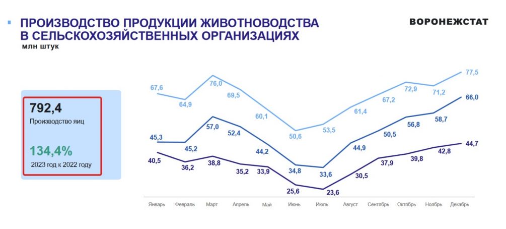 Примечательно, что снижение объемов производства и продаж куриных яиц на местных птицефабриках произошло в условиях резкого роста производства этой продукции (на 34,4%) в 2023 году. По данным Воронежстата, за прошлый год на воронежских птицефабриках было произведено 792,4 млн штук, что в среднем составляет 66 млн яиц в месяц.