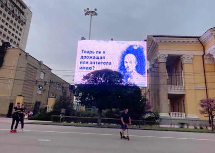 Надпись «Тварь ли я дрожащая или антитела имею» появилась на интерактивном баннере главной площади регионального центра. Рядом с фразой изображен портрет Федора Достоевского — классика, чью формулировку изменили для ковидной пропаганды.