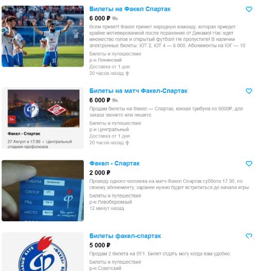 Вот и сейчас на «Авито» уже появились предложения с десятикратным завышением цен билетов на матч «Факела» со «Спартаком». Их продают по 5-6 тысяч рублей.