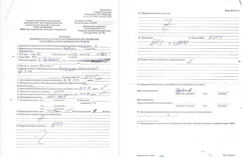 Когда волжские врачи обнаружили у Ольги Юрьевны раковые клетки, ее стали обследовать в онкодиспансере. Там потребовали справки из волгоградской больницы, где она оперировалась, в том числе результаты биопсии, эпикриз и все соответствующие документы. Но, как рассказывает Тамара, после запроса в волгоградскую больницу, выяснилось, что никаких выписных эпикризов у них нет.