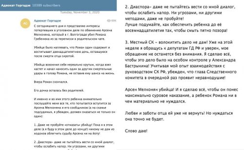 Известный адвокат из Москвы Шота Горгадзе стал представителем потерпевшей стороны в уголовном деле по обвинению Арсена Мелконяна, который нанес смертельные ранения Роману Гребенюку 23 октября в отделении «Сбербанка» в Волгограде. Об этом он объявил в своем Телеграм-канале 3 ноября: