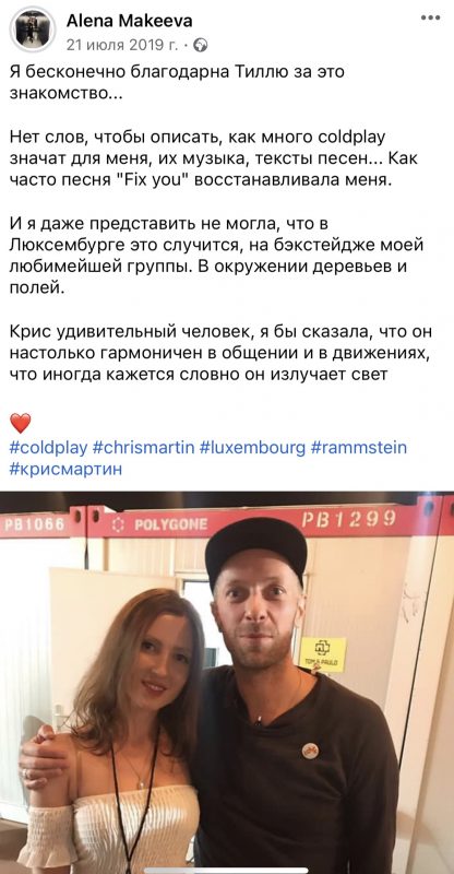 Отмечается, что на личных страницах в соцсетях россиянки опубликовано множество фотографий с фронтменом Rammstein. Также у девушки есть фото и с другими знаменитостями, например, с австралийским рок-музыкантом Ником Кейвом и эстонским рэп-исполнителем Томми Кэшем.