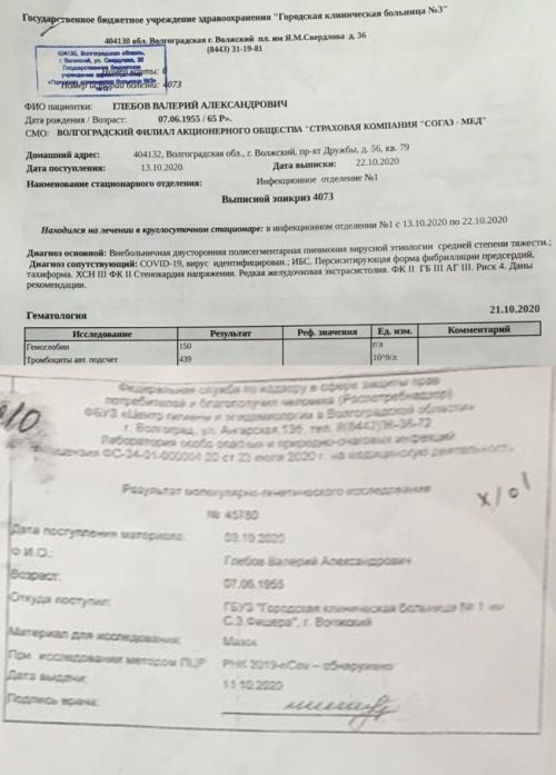 Со слов Руслана, за три дня до выписки у Валерия Александровича поднялась температура, появились кашель и одышка. Несмотря на это, мужчину выписали из больницы и направили к специалисту. В итоге компьютерная томография выявила около 50% поражение легких, а анализы на коронавирус были положительными.