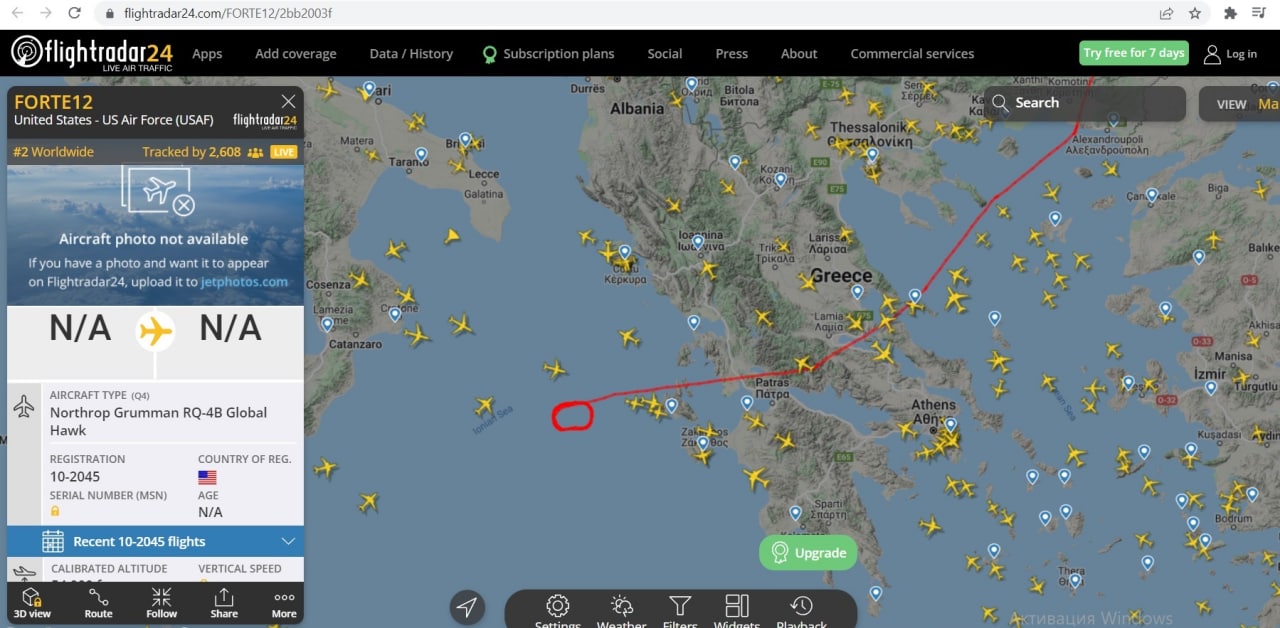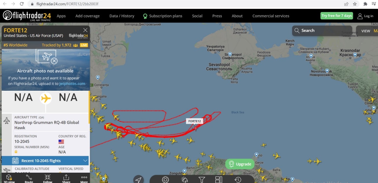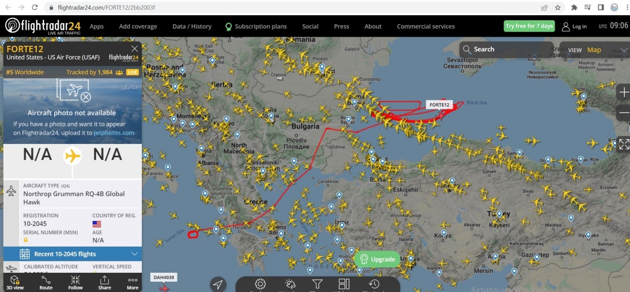 Global Hawk пролетел через Грецию и Болгарию, после чего свернул на восток и сделал большое количество кругов в водах Чёрного моря.