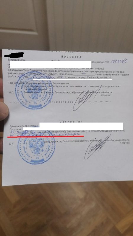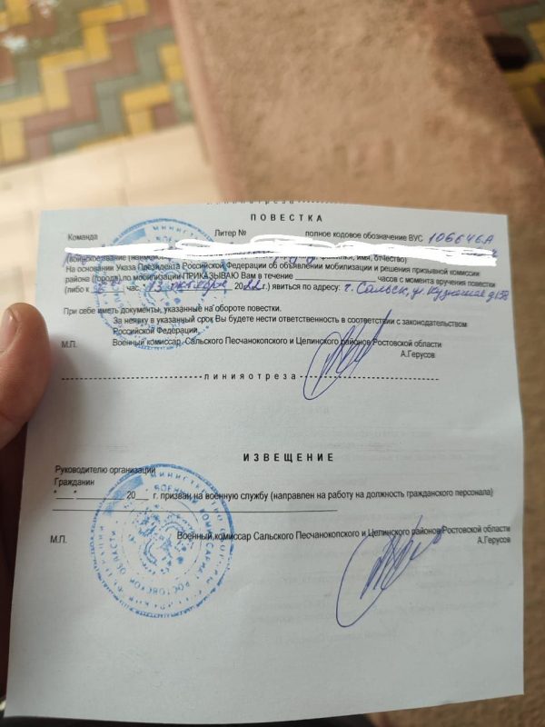 Первые данные о возобновлении мобилизации в Ростовской области появились еще утром 11 октября. Так, в одном из пабликов социальной сети Вкотакте местный житель Сальска рассказал, что ему пришел документ, в котором говорится, что он должен в ближайшие дни явиться в военкомат. И это не единственная повестка, которую получили жители Ростовской области. В редакцию прислали еще одну фотографию из Сальска.