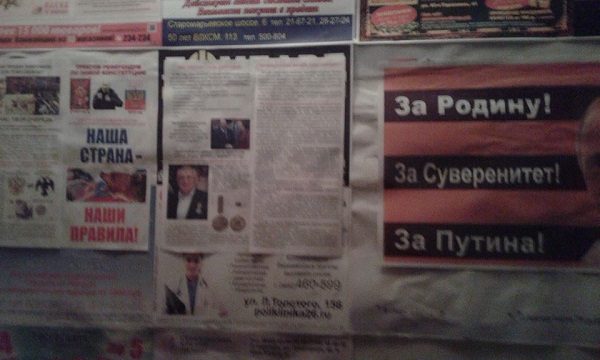 Необычный лифт появился в третьем подъезде дома № 71/2 по ул. 50 лет ВЛКСМ. Стены кабины обклеены плакатами и лозунгами в поддержку Владимира Путина. С одной стороны материал о проведенной с ним конференции, с другой — плакат с тремя лозунгами: «За Родину! За суверенитет! За Путина!».