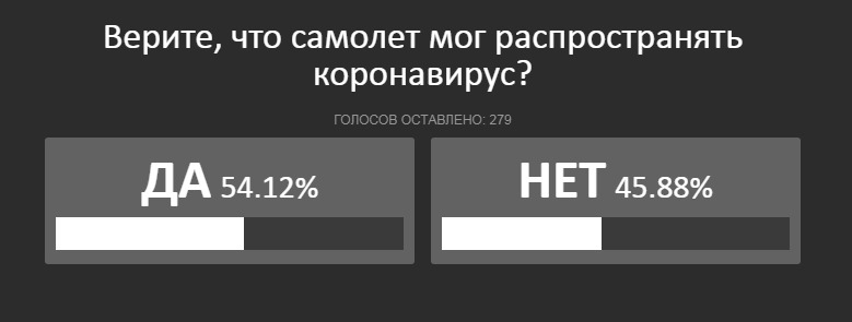 Под публикацией в «Блокнот Волжский» горожане прошли опрос - более половины читателей поверили, что самолет мог распространять COVID-19. Из 279 человек 54,12% посчитали, что история может быть правдой.