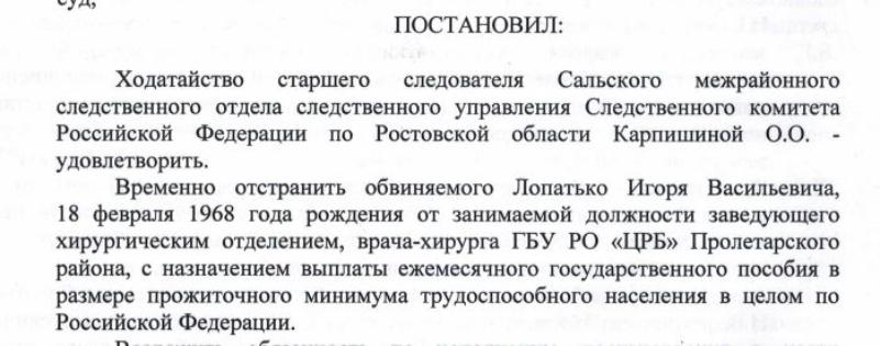 По факту смерти ребенка в сентябре 2022 года было возбуждено уголовное дело в отношении неустановленного круга лиц по части 2 статьи 109 УК РФ («Причинение смерти по неосторожности»). В марте 2023 года обвинение по этой же статье было предъявлено заведующему хирургическим отделением ЦРБ Пролетарского района Лопатько, а уже в мае суд удовлетворил ходатайство следователя об отстранении врача от работы.