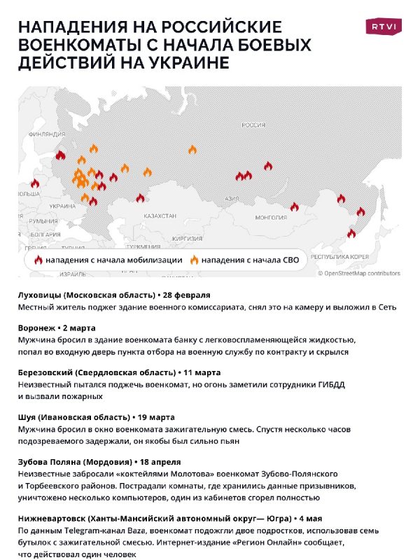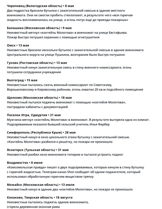 С начала специальной военной операции в России произошло множество (по меньшей мере 20) случаев атаки на военкоматы в разных городах. В основном речь идет о поджогах, в том числе с применением "коктейлей Молотова" (как, например, в мае в Нижневартовске).