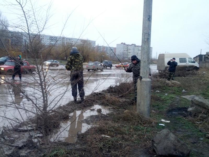 Вчера, 13 января, в волгоградцы наблюдали необычную картину - в Дзержинском районе на проезде Дорожников собрались четверо рыбаков. Причем все мужчины были в рыбацком обмундировании, с удочками и в резиновых сапогах. ( К слову сказать, в другой обуви там и не пройти). Волгоградцы стояли на дороге и ловили в ямах, которые сейчас больше напоминают озера. Да вот только конечно никакой рыбы там нет, но улов все равно оказался - чьи-то потерянные в яме госномера и несколько колесных арок.