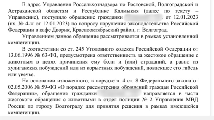 В частности, были направлены обращения в Управление Россельхознадзора по Ростовской, Волгоградской, Астраханской областям и Республике Калмыкия, а также в отдел полиции №2 управления МВД России по городу Волгограду.