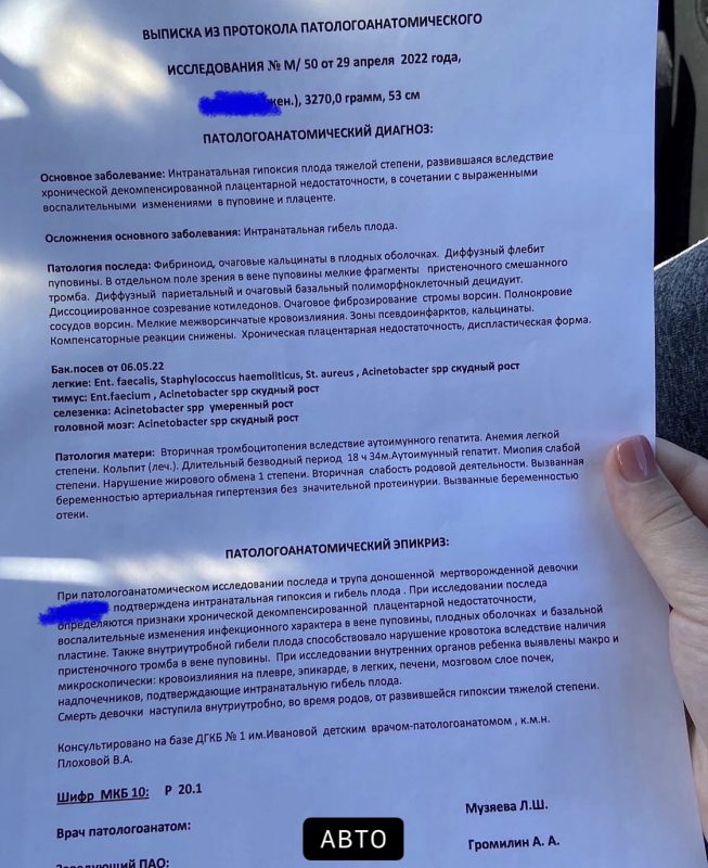 Как указано в патологоанатомическом эпикризе, «внутриутробной гибели плода способствовало нарушение кровотока вследствие наличия пристеночного тромба в вене пуповины. При исследовании внутренних органов ребёнка выявлены макро и микроскопически: кровоизлияния на плевре, эпикарде, лёгких, печени, мозговом слое почек, надпочечников, подтверждающие интравагинальную гибель плода. Смерть девочки наступила внутриутробно, во время родов, от развившейся гипоксии тяжёлой степени».