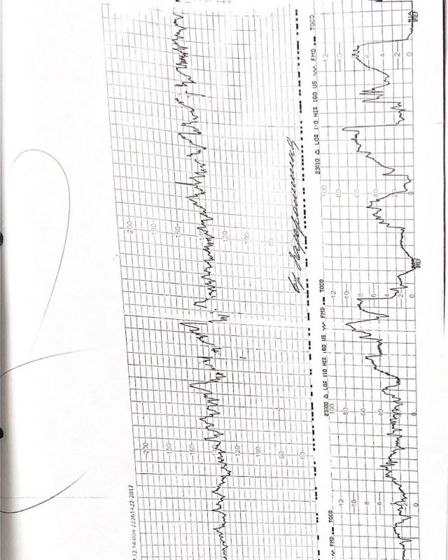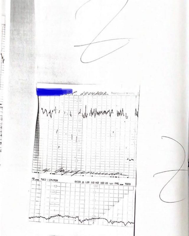 По её словам, медики не проверяли КТГ (кардиотокография — непрерывная синхронная регистрация частоты сердечных сокращений плода и тонуса матки с графическим изображением сигналов на калибровочной ленте), и только в час ночи, спустя 18 часов, решили предпринять меры по родовспоможению.