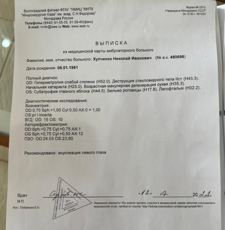 Позже Николай Хупченко проходил обследование и лечение в Волгограде. Там, как он утверждает, врачи пришли к выводу, что сетчатка глаза лопнула из-за воспалительного процесса. Врачи удалили ему глаз, сейчас вместо глаза у Николая Ивановича установлен протез.