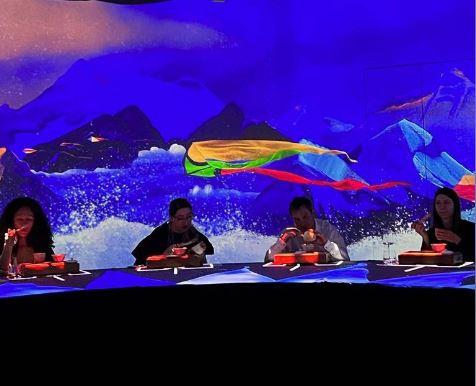 «Меня подсвечивает с разных сторон отражения картин на стенах зала и специальные приборы, - продолжает предпринимательница, - которые дополняют визуальный ряд на столах. Точнее, на столе, потому что нас 20 избранных в этот вечер, и мы сидим за одним круглым столом. Я трогаю цифровые лимоны, и они начинают катиться, я трогаю плывущих по столу рыб, и они выплескивают мне оцифрованные пожелания».