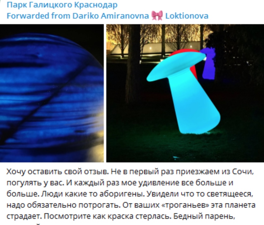 Ранее посетители парка Галицкого жаловались на неприличное поведение отдыхающих, которые ломают недавно установленные скульптуры. К примеру, туристка из Сочи выразила свое негодование по поводу отношения посетителей к местным инсталляциям в официальном аккаунте соцсетей парка. Девушка отметила, что люди ходят по газонам и пытаются потрогать светящиеся объекты, и даже использовала термин "аборигены" для описания такого поведения. Официальный телеграм-канал парка опубликовал отзыв туристки из Сочи, в комментариях к посту краснодарцы преимущественно согласились с гостьей города.