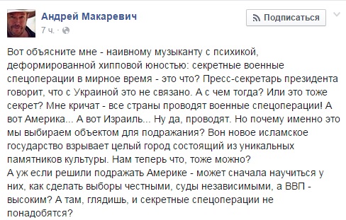 "Вот объясните мне - наивному музыканту с психикой, деформированной хипповой юностью: секретные военные спецоперации в мирное время - это что? Пресс-секретарь президента говорит, что с Украиной это не связано. А с чем тогда? Или это тоже секрет?..." - написал Макаревич в Facebook.