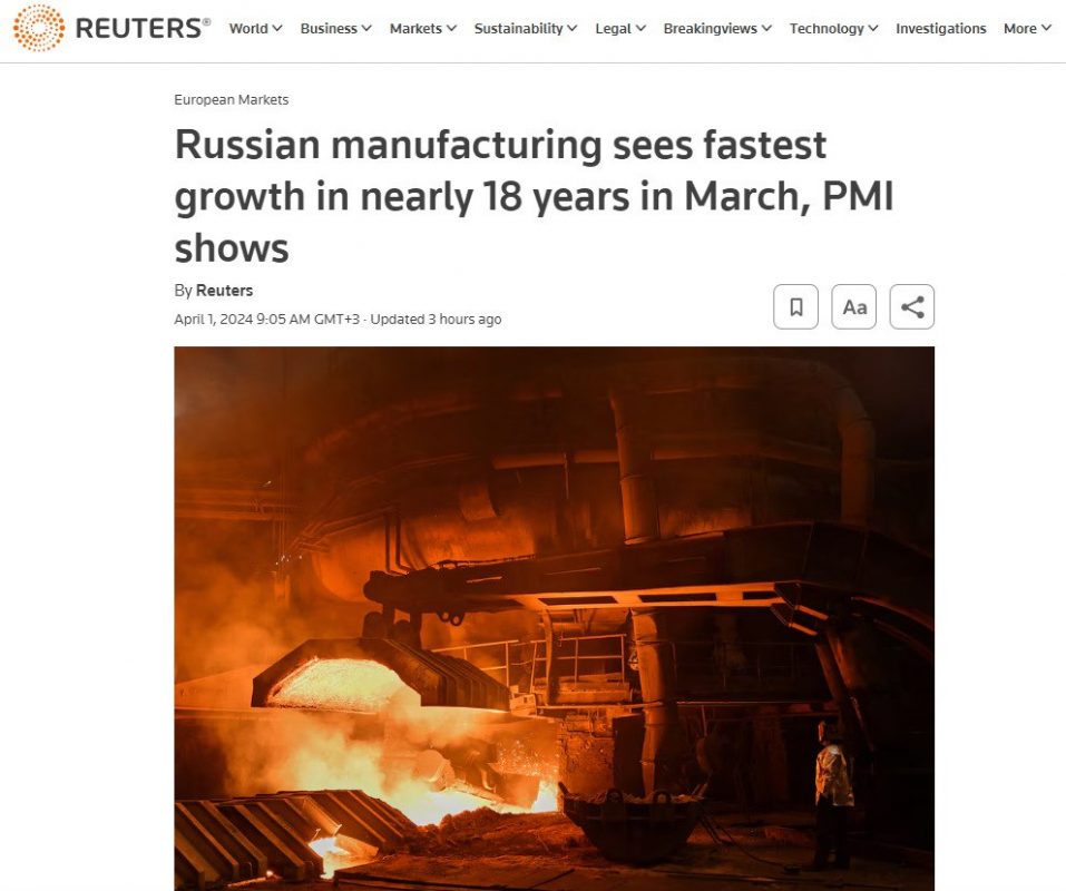 Активность в производственном секторе России выросла самыми быстрыми темпами с августа 2006 года. Индекс PMI для российского производства в марте 2024 года составил 55,7 пункта, поднявшись с февральских 54,7 пункта, сообщает Reuters со ссылкой на исследование S&P Global.