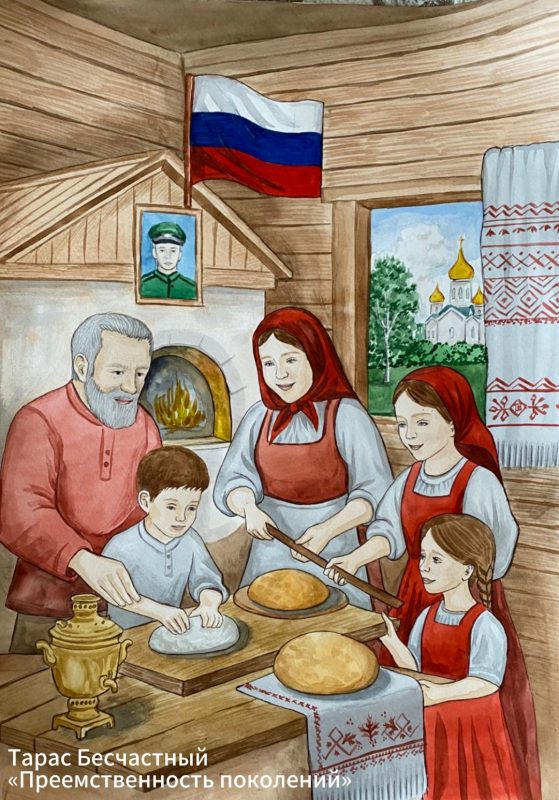 Тарас Бесчастный из Большекрепинской отразил традиционные российские ценности в рисунке. В своей работе он подчеркнул, как важна преемственность поколений.