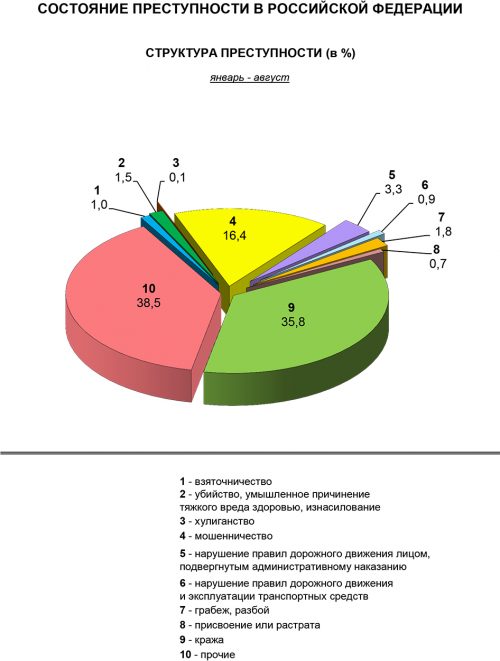 Всего по данным министерства, в России с января по август текущего года зарегистрировано более 1,3 млн преступлений. Это на 0,8% меньше, чем за тот же период прошлого года. Чаще всего в стране совершается хищений (54%). Более трёх тысяч преступлений было совершено с использованием оружия, боеприпасов, взрывчатых веществ, взрывных или имитирующих их устройств. В большинстве регионов страны фиксируется снижение правонарушений.