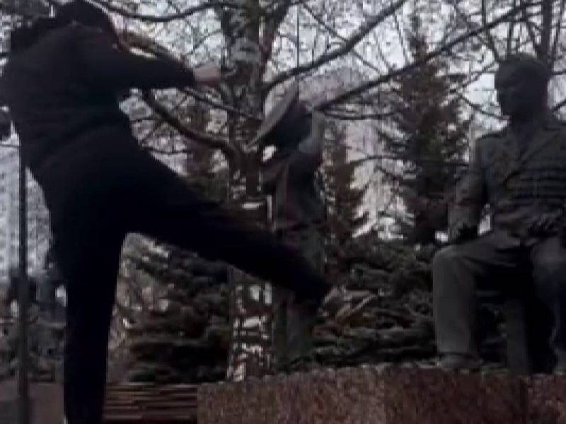 Помимо «кулачных упражнений», на кадрах видео можно заметить элементы тренировки, во время которых спортсмен накинул на шею скульптуры ребенка трос. Кроме того, мужчина избивал памятник ногами. Судя по реакции самого автора видео, он пребывает в хорошем расположении духа и радуется происходящему.