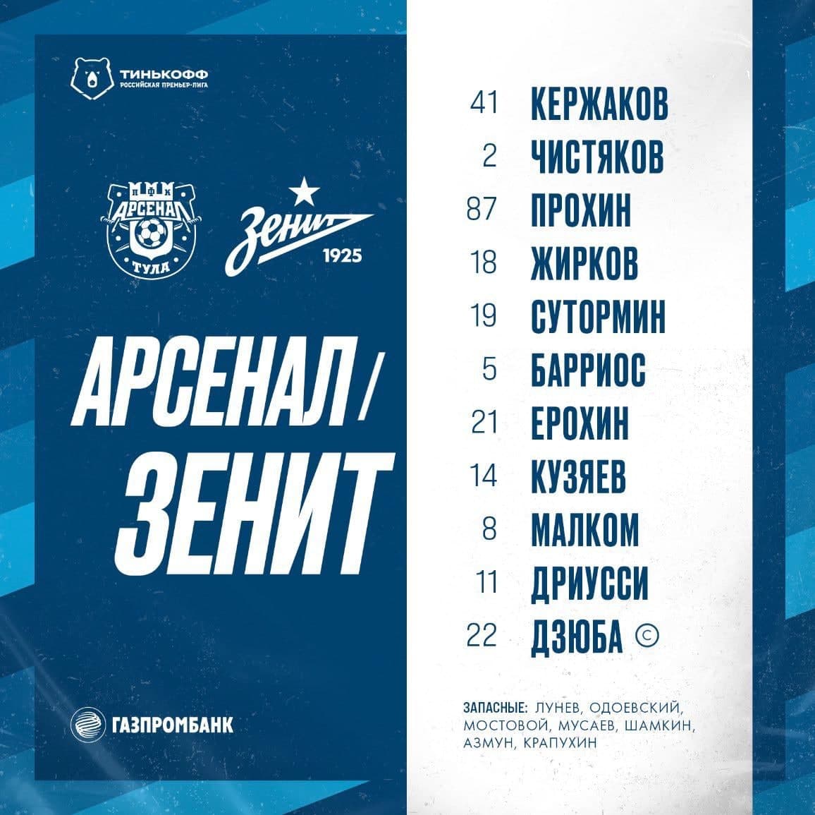 Кроме Дзюбы, бело-голубые выставляют следующий основной состав: Михаил Кержаков, Дмитрий Чистяков, Данила Прохин, Юрий Жирков, Александр Ерохин, Алексей Сутормин, Далер Кузяев, Вильмар Барриос, Себастьян Дриусси и Малком.