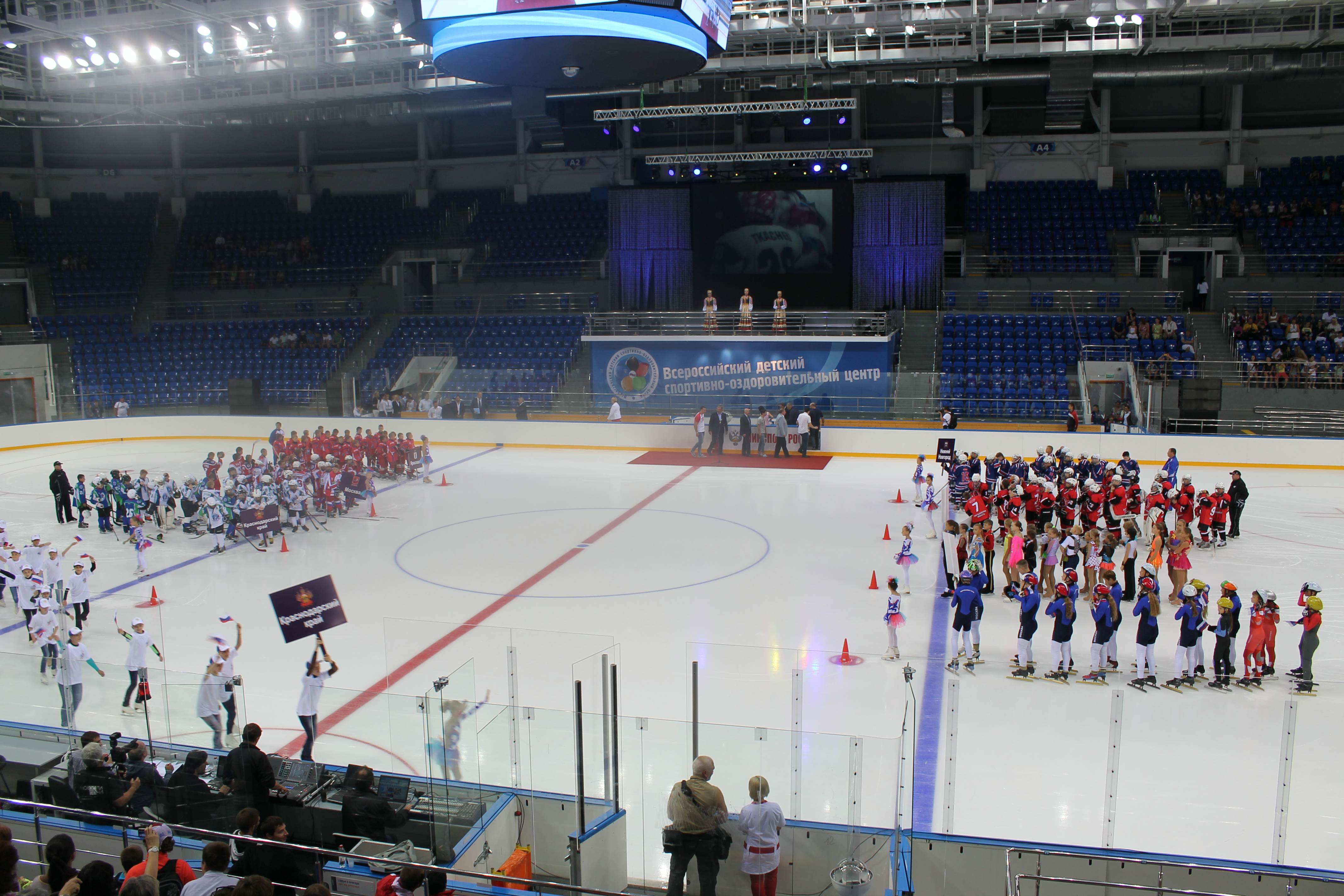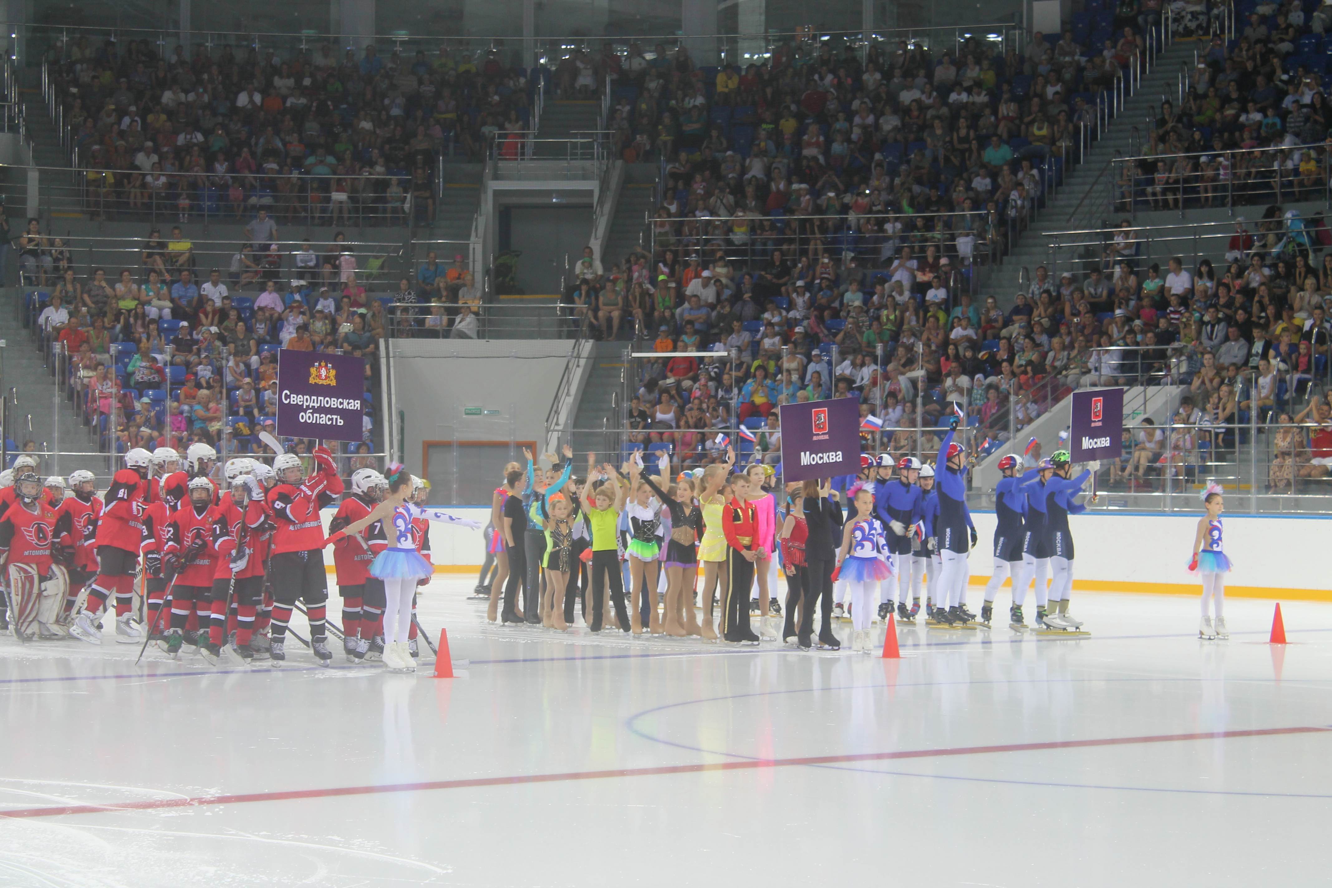 На Малой ледовой арене «Шайба», на базе которой расположился Центр, прошел парад всех участников первой смены, они показали свои лучшие выступления.