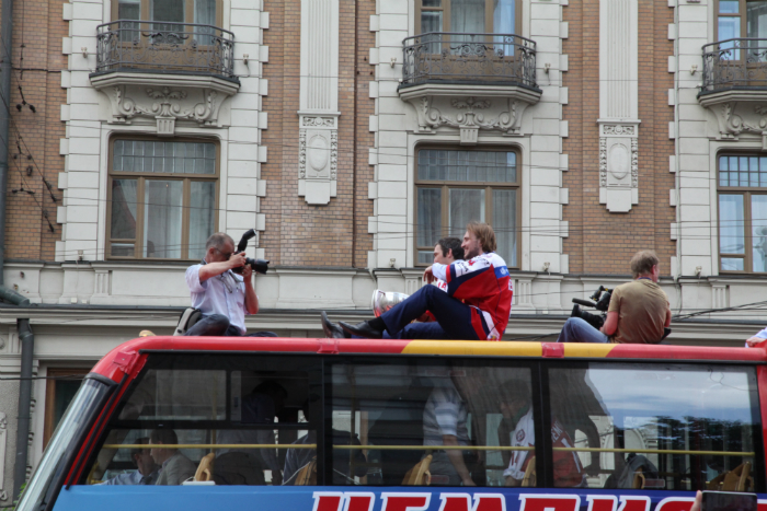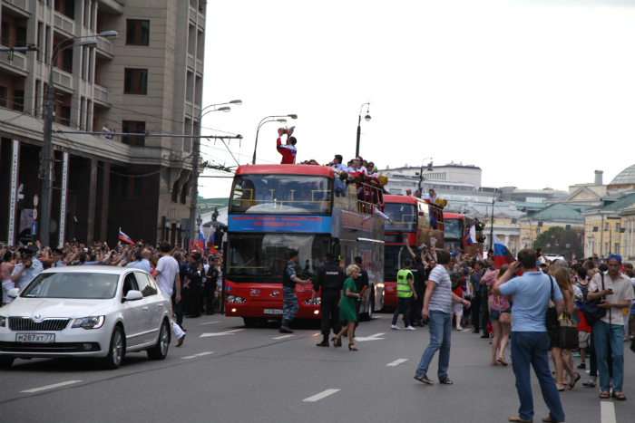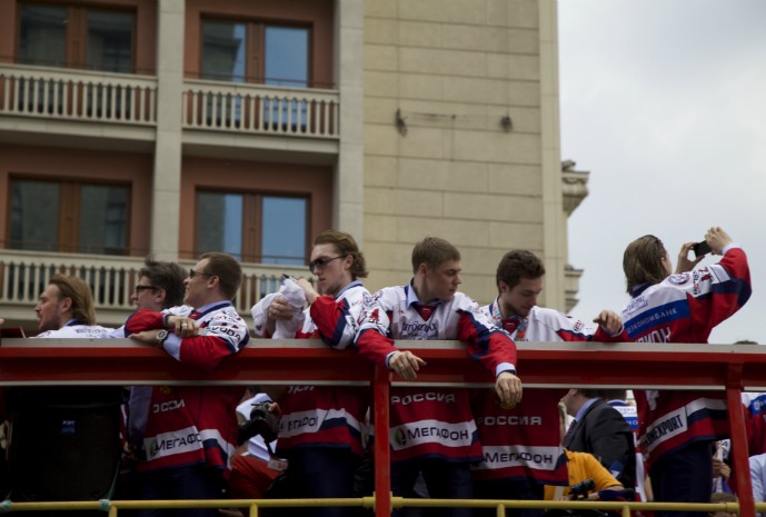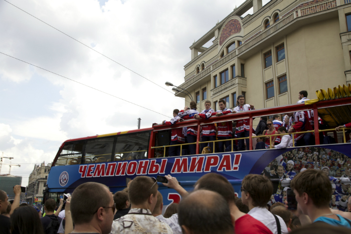 Сегодня по маршруту Пушкинская площадь-Красная Площадь российская сборная везла главную награду. Сотни зевак, туристов, а также фанатов хоккея приветствовали спортсменов.