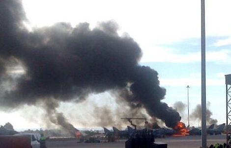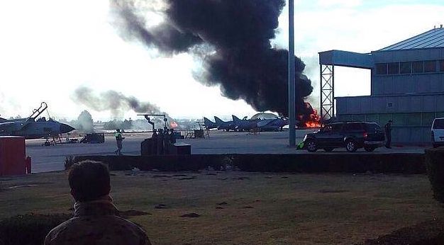 В настоящее время база ВВС оцеплена полицией. На месте работают пожарные и спасатели, к спасательным работам привлечены вертолеты.