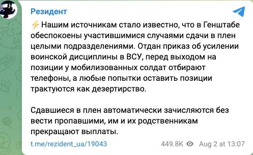 Вот и остается один путь - сдаться в плен. Но и тут украинских боевиков ждет «засідка» (засада). Как сообщает украинский телеграм-канал «Резидент» со ссылкой на свои источники в офисе президента Владимира Зеленского, сбежавшие попадают в списки пропавших без вести, и их родственники автоматически перестают получать все выплаты от государства.