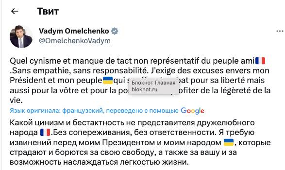 Оскорбленный до глубины души посол Украины во Франции Вадим Омельченко потребовал извинений от французского телеканала RTL. И все за высказывание о президенте Незалежной Владимире Зеленском. Французские журналисты не просто сравнили приезд украинского лидера в их страну с шапито. Они поиздевались над Владимиром Зеленским: в эфире RTL журналисты анонсировали дальнейшее «турне цирка Зеленского по Европе» и его встречи с европейскими политиками как рекламное объявление циркового выступления, «чтобы помочь Украине».
