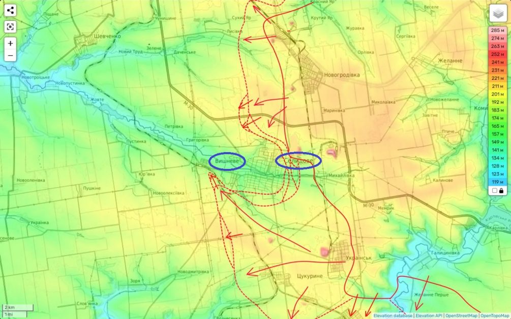 Некоторые источники утверждают, что российская армия уже контролирует около половины города, включая промышленные зоны на востоке и частный сектор в восточной и южной частях. Главный рубеж обороны ВСУ, основанный на высотных зданиях, пока остается под угрозой. В данный момент наши войска стремятся выйти к реке Солёная восточнее Вишневого. Если им удастся установить визуальный контроль над последней дорогой, ведущей в Селидово с запада (со стороны Покровска), это будет значительным успехом. До этой цели остается пройти всего немногим более полукилометра. В случае достижения этой цели гарнизон ВСУ окажется в ловушке.