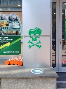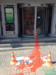ФОТО. Также вход в здание офиса «Сбербанка» протестующие облили краской.