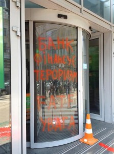 Активисты облили красной краской, на дверях сделали надписи, на стенах нарисовали «зеленых человечков» и требовали остановить работу банка. На этом активисты не остановились, они специально принесли с собой флаг «Народного сопротивления Донбасса» и облили его краской.