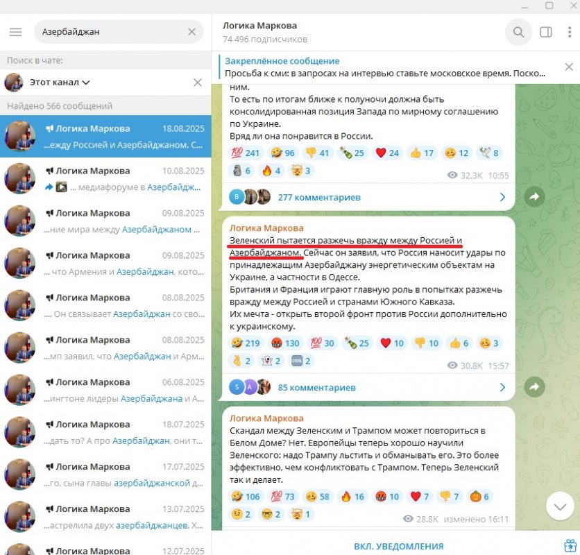 Любопытно, что при этом Марков* начал старательно молчать на азербайджанскую тему. Забыл он и про бакинского царька Ильхама Алиева. Хотя ранее вспоминал Азербайджан (в комплиментарном ключе) регулярно. Последний раз – за четыре дня до получения статуса иноагента. 18 августа Марков*, в упор не видевший прямо враждебные действия и заявления Баку в адрес России, дал понять: азербайджанцы хорошие, а вся кажущаяся отчужденность – результат подлого разжигания со стороны нелегитимного президента Украины Владимира Зеленского.