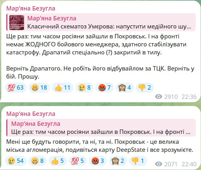 Новость прокомментировал известный офицер ВСУ С. Бунятов: «Зашли в сам Покровск или нет, не очень играет роль, в Селидово до последнего не заходили. Мы привыкли цепляться за медиа, но это не имеет ничего общего с тактикой и стратегией. Город мы теряем уже сейчас, в момент, когда русские обходят его по флангам».