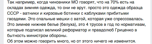 «Когда чиновники МО говорят, что на 70% есть на складах зимняя одежда, то они не врут. Просто это одежда образца СССР – ватники и кирзовые ботинки с каблуками, прибитыми гвоздями», - написал Доник.