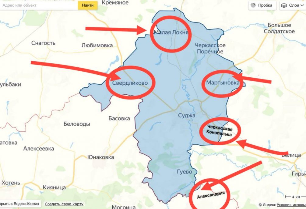 Наши войска в свою очередь продвигаются в окрестностях сразу четырнадцати населенных пунктов (Викторовка, Свердликово, Косица, Куриловка, Лебедевка, Леонидово, Малая Локня, Николаевка, Николаево-Дарьино, Новая Сорочина, Мартыновка, Русское Поречное, Черкасская Конопелька, Александрия).