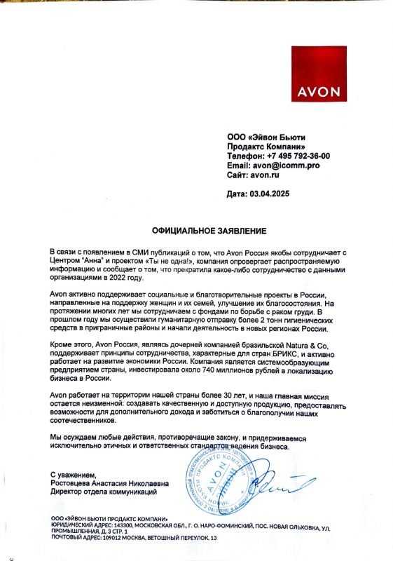 Мы опровергаем распространяемую информацию о том, что Avon Россия якобы сотрудничает с Центром «Анна» и проектом «Ты не одна!». Компания прекратила какое-либо сотрудничество с организациями в 2021 году.