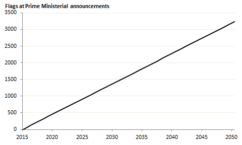 Еще неделю назад, делая менее важное заявление, премьер предстал на фоне шести флагов. И уже это раззадорило интернет-общественность. В Сети появились остроумные графики, вроде этого, показывающие забавы ради экспоненту увеличения числа флагов, которые австралийские премьеры будут использовать к 2050 году: