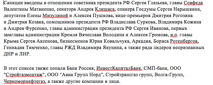 В списке новых санкций значатся: глава Совфеда Валентина Матвиенко, спикер Госдумы Сергей Нарышкин, вице-премьеры Дмитрий Рогозин и Дмитрий Козак, советник президента РФ Сергей Глазьев, сенатор Андрей Клишас, депутаты Елена Мизулина и Алексей Пушков.