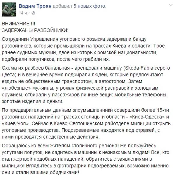 Схема их разбоев была банальная, сообщил на своей странице в Facebook начальник Киевской областной милиции Вадим Троян. Трое ранее судимых мужчин, двое из которых ромской национальности, арендовали автомобиль Skoda Fabia серого цвета. В вечернее время они подбирали людей, которые предпочитают ездить не общественным транспортом, а автостопом.