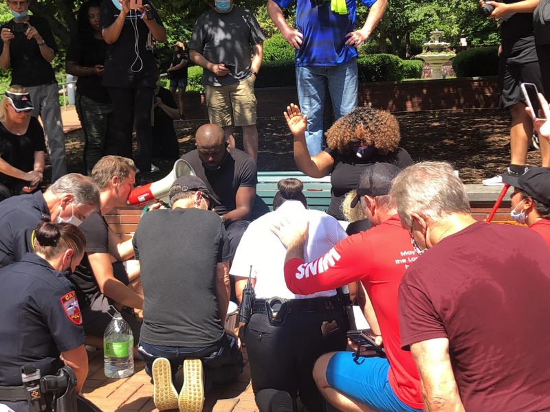 Колени приклоняют и полицейские перед толпами протестующих. В нескольких штатах сотрудники полиции во время митингов становились на одно колено в знак того, что им стыдно за своего коллегу, который убил афроамериканца во время задержания, и они не поддерживают его действия.