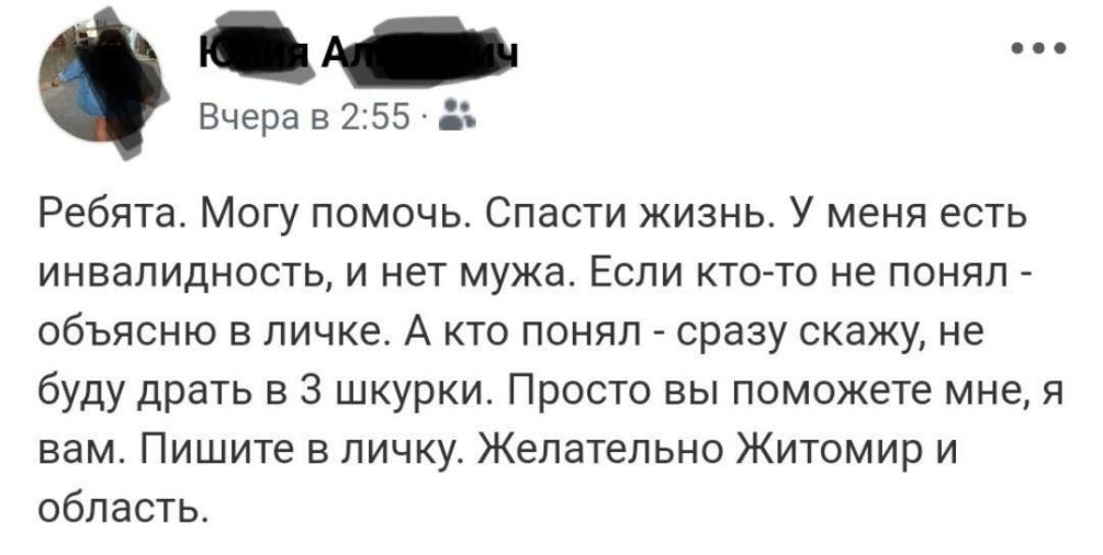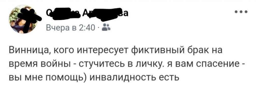 «Я вам – спасение, вы мне – помощь», «Не буду драть три шкурки» и другие посты с прямолинейными и достаточно циничными брачными объявлениями от женщин-инвалидов все чаще встречаются в украинских соцсетях. И судя по всему, недостатка в женихах там не испытывают.