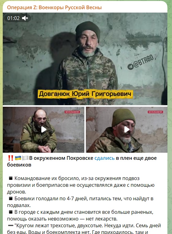 Бойцы на передовой отмечают, что у подразделений ВСУ в Покровске закончились запасы продовольствия, а медики остались без лекарств и оборудования. Из-за этого, по их словам, раненые умирают без возможности эвакуации — все подъезды к городу находятся под контролем российских войск, а любое передвижение противника фиксируется и подавляется операторами беспилотников.