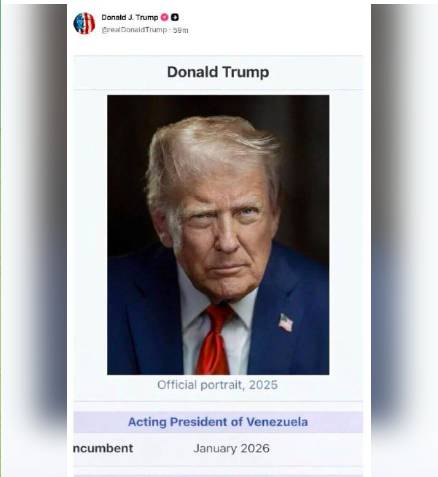 Что ни день, то потрясающие события (в прямом смысле слова). И в большинстве случаев потрясает президент США Дональд Трамп. На своей странице в Truth Social американский лидер ошарашил мир новостью, что у Венесуэлы новый президент, и это он, любимый. В соцсети размещен скриншот (по типу данных в «Википедии»), где указано, что с января 2026 года Трамп, то есть он, является действующим президентом Венесулы. Назначение состоялось якобы в январе 2026 года. При этом действующую должность президента США Трамп за собой оставил.