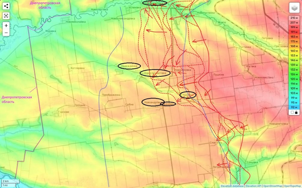 Тем не менее, вероятно, что эти темпы замедлятся, как только мы упремся в следующую линию обороны ВСУ на рубеже Новоалександровка — Надеждинка. Интересно отметить, что от этого рубежа до самой Днепропетровской области также нет никаких укреплений.