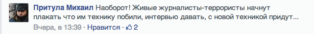 Причем, в комментариях на своей странице Фейсбук, Притула пошел еще дальше, намекнув, что репортеров нужно убивать, поскольку «живые они начнут плакать, что им технику побили, интервью давать», а затем вернутся с новой техникой.